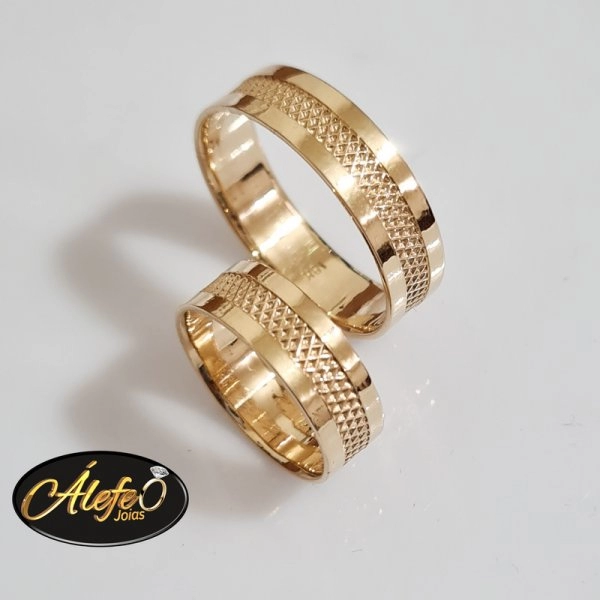 Par de Alianças em Ouro 18k , Modelo Reta Trabalhada ,
