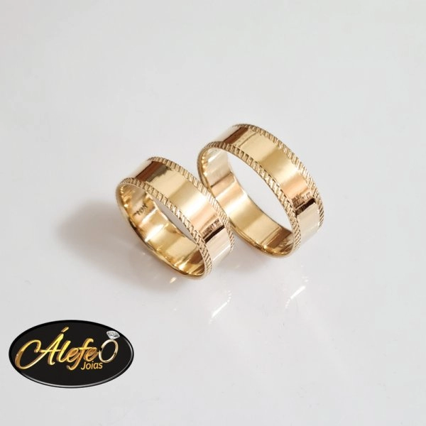 Par de Alianças em Ouro 18k , Modelo Reta Trabalhada Com pedra ,